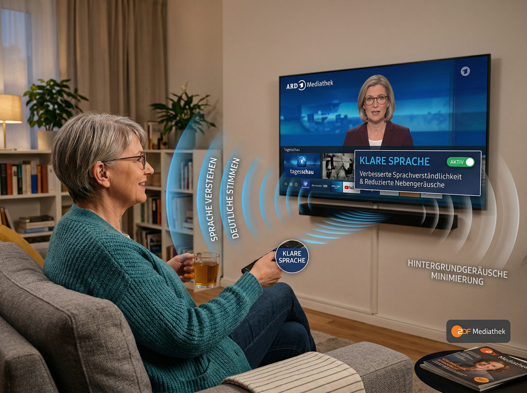 Auch ARD und ZDF bieten eine spezielle Tonspur namens „Klare Sprache“ an. Diese Tonspur wird sendeseitig optimiert – Stimmen werden klarer gemischt, Hintergrundanteile reduziert.